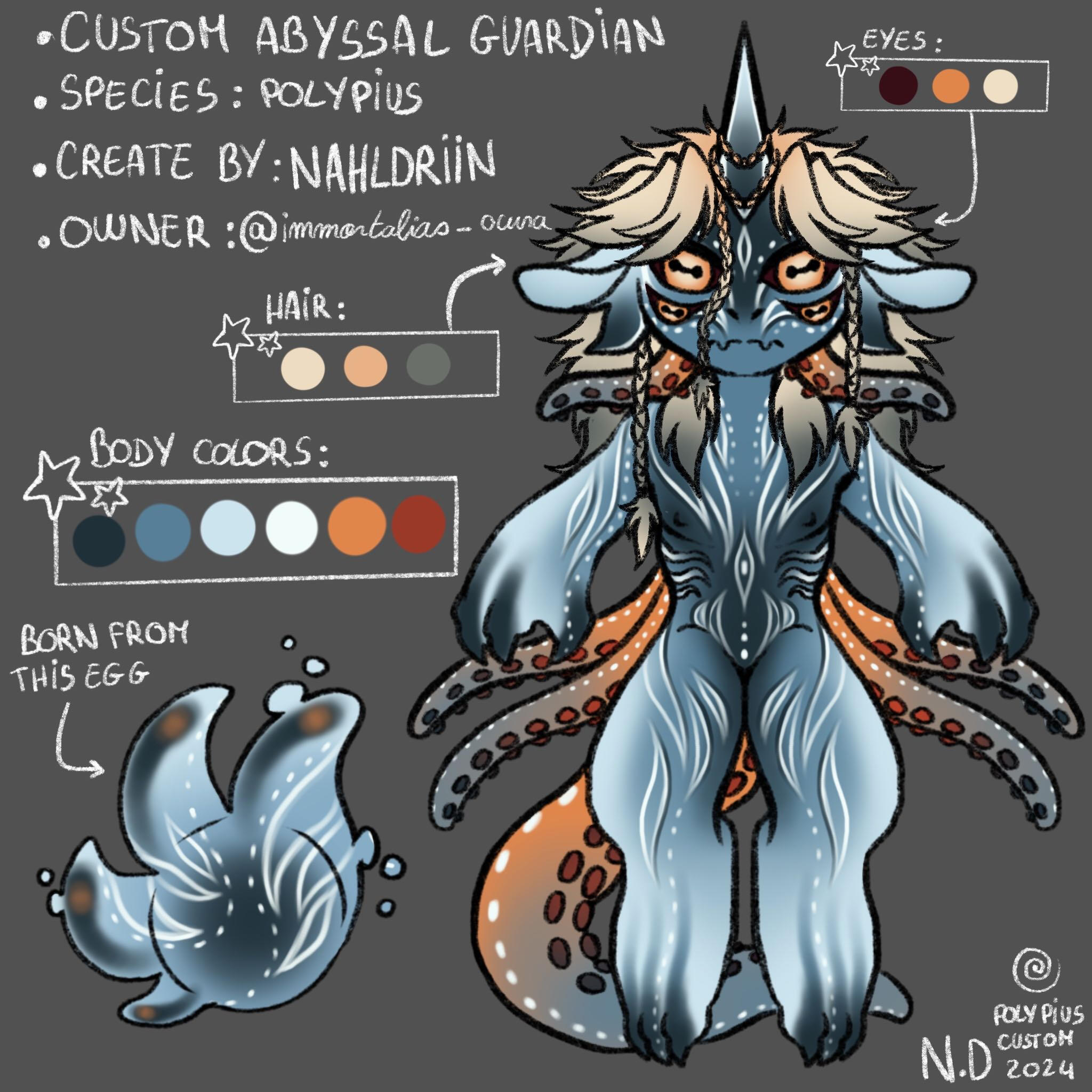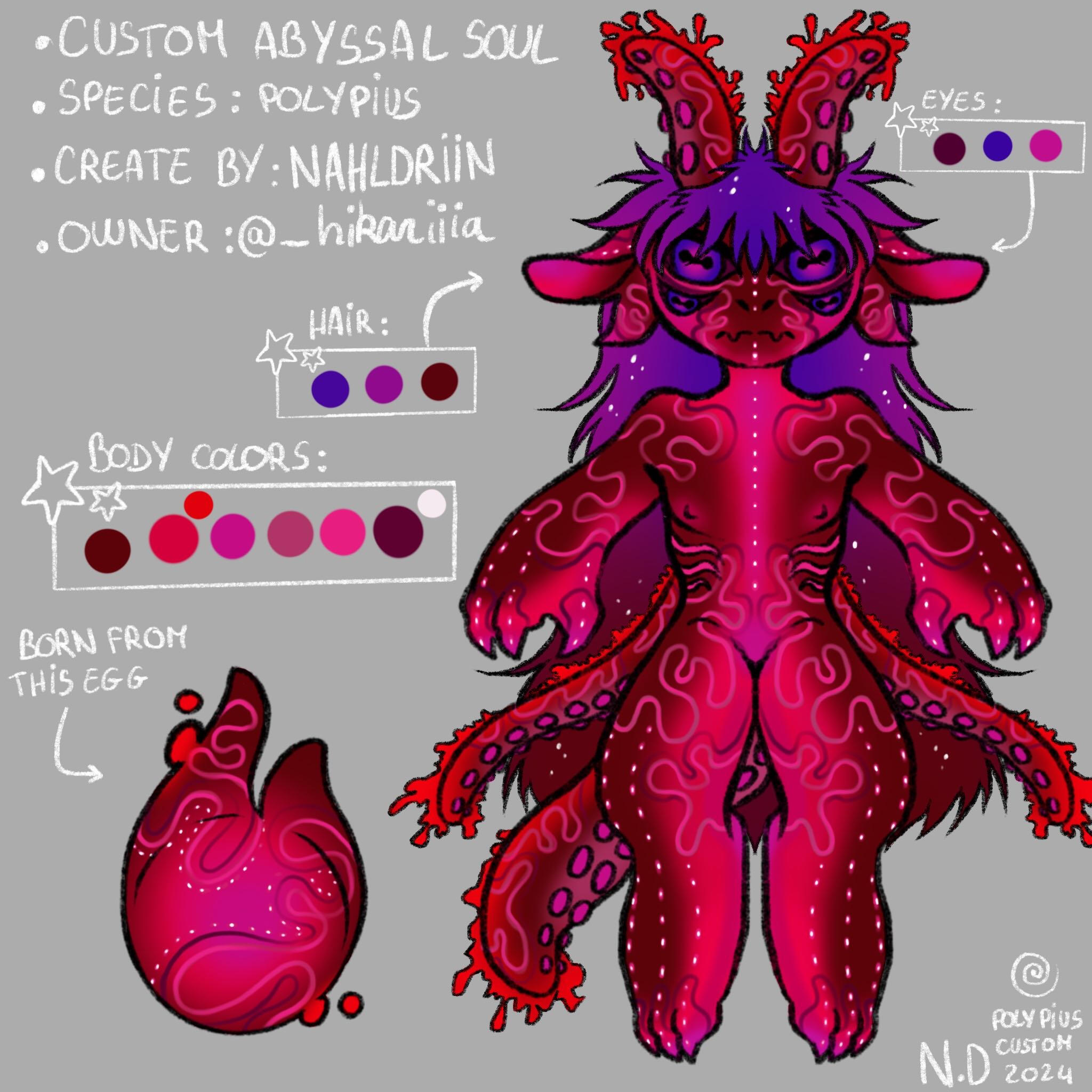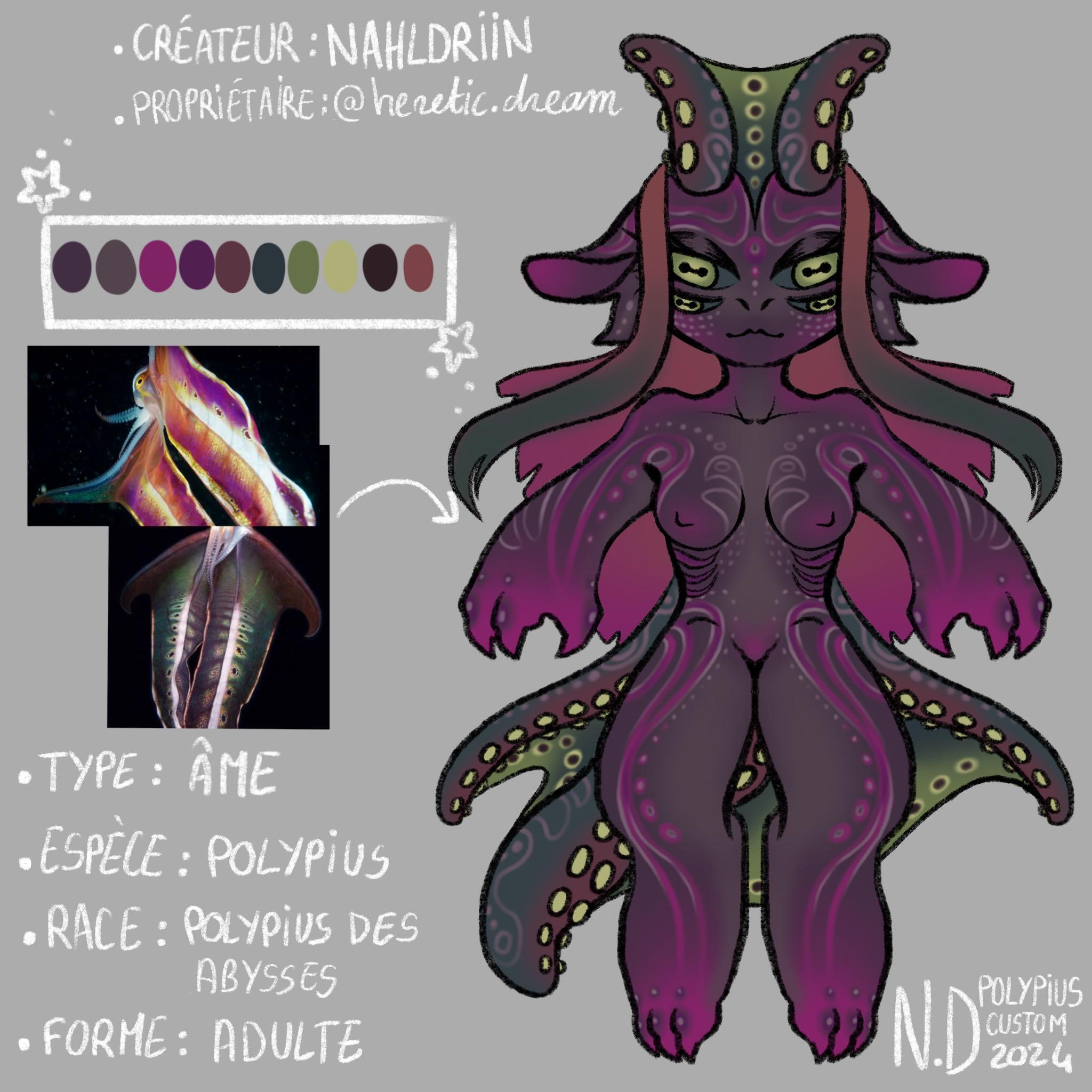 REMINDERPolypius is a private species created by Nahldriin, only Nahldriin can create Polypius. These are available during adoptions, with mystery eggs for example.WHAT CAN I DO WITH MY POLYPIUS ?Once adopted, your polypius belongs to you. You can modify it slightly as long as the basic design is recognizable, but I ask you to go through Nahldriin to validate any changes.However, when modifying your polypius, please respect the traits of the species ! For example, a polypius can't have wings, horns (unless it's a guardian horn) or a different tail (wolf or demon, for example).If your polypius is a soul, it cannot change category once obtained. Your soul cannot become a guardian or a deity, and vice versa.You must respect the physical traits of the different types of polypius (visible in the Polypius species page). For example, if your polypius is a soul, you can't add a second pair of dorsal tentacles like guardians - the soul must remain a soul after all !Your polypius can be included in your personal worlds and stories, as long as the territorial requirements of the species (seawater) and its type (surface or abyss) are respected.If you share your stories on social networks, please specify your character's species of origin and creator.!!! Please don't create merch related to my species !!!I'M NO LONGER ATTACHED TO MY POLYPIUS, WHAT CAN I DO ?If you wish to part with your polypius, you can : give it away, sell it or exchange it.In the case of a donation, please contact me as soon as possible so that I can change the owner's name on the adoption certificate ! This allows me to keep track of the owners. The new owner will be given access to the server if they are not already on it, so that they can consult the various rules governing the species and the lore (more on the server than here !).In the case of a sale, please do not sell your polypius for more than you paid for it ! The only exception is if your polypius possesses several arts that you sell with the character. In this case, please contact me so that I can validate your price quote. Since polypius are an affordable species (especially souls and guardians), I don't want to see sales that reach prices that are far too high without justification !