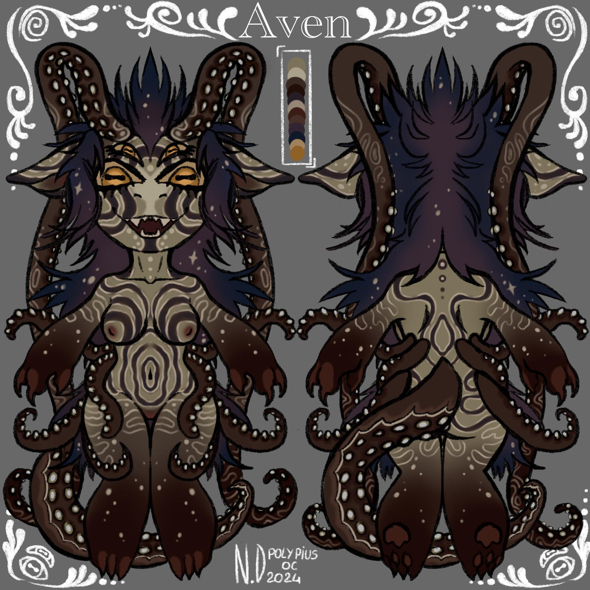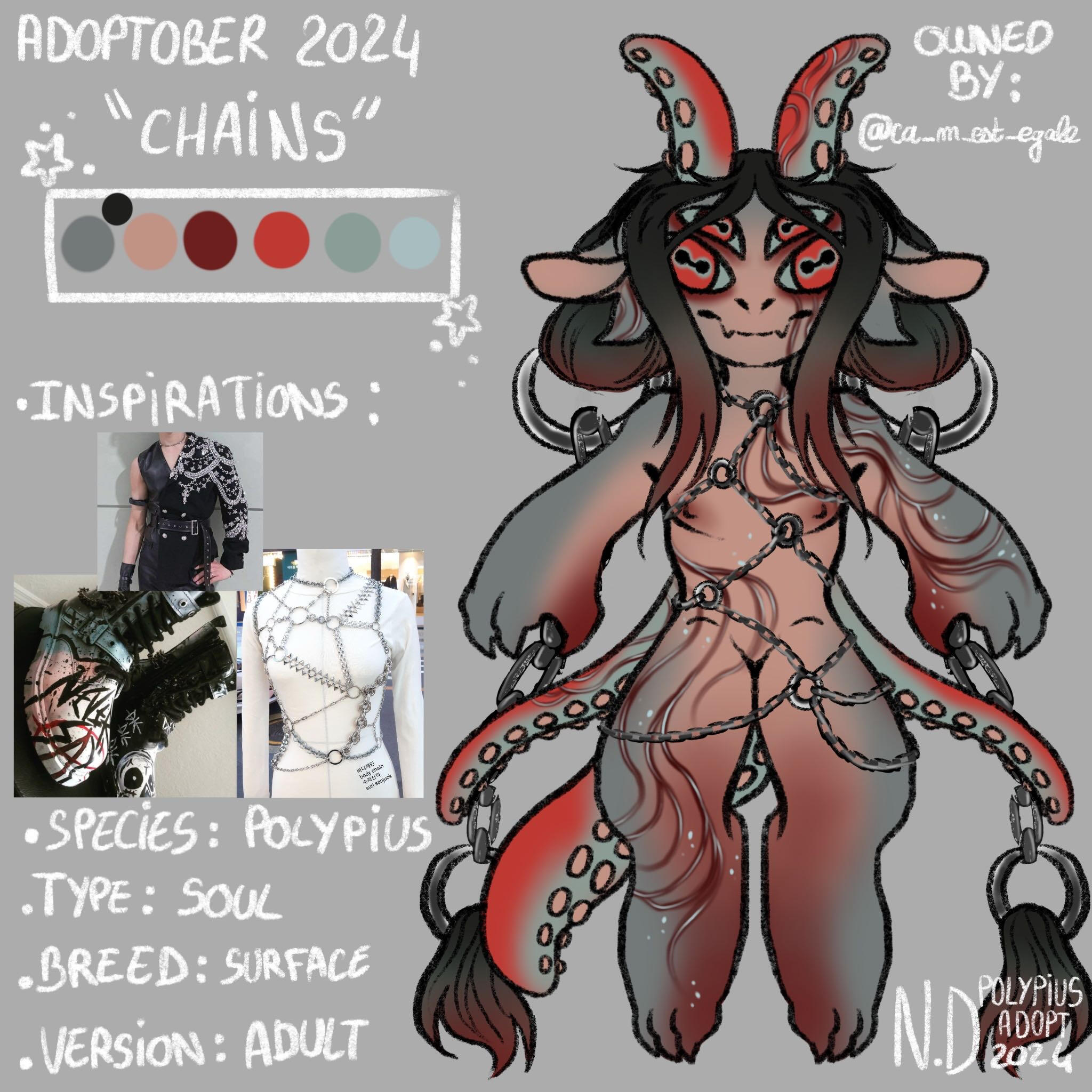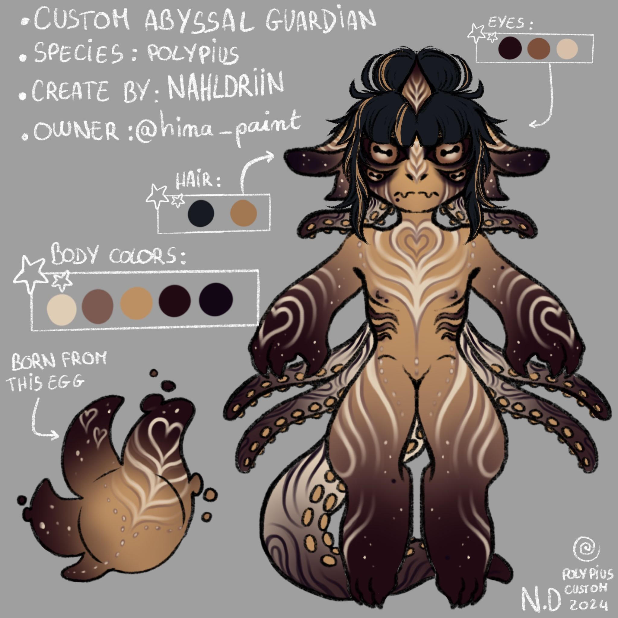 REMINDERPolypius is a private species created by Nahldriin, only Nahldriin can create Polypius. These are available during adoptions, with mystery eggs for example.WHAT CAN I DO WITH MY POLYPIUS ?Once adopted, your polypius belongs to you. You can modify it slightly as long as the basic design is recognizable, but I ask you to go through Nahldriin to validate any changes.However, when modifying your polypius, please respect the traits of the species ! For example, a polypius can't have wings, horns (unless it's a guardian horn) or a different tail (wolf or demon, for example).If your polypius is a soul, it cannot change category once obtained. Your soul cannot become a guardian or a deity, and vice versa.You must respect the physical traits of the different types of polypius (visible in the Polypius species page). For example, if your polypius is a soul, you can't add a second pair of dorsal tentacles like guardians - the soul must remain a soul after all !Your polypius can be included in your personal worlds and stories, as long as the territorial requirements of the species (seawater) and its type (surface or abyss) are respected.If you share your stories on social networks, please specify your character's species of origin and creator.!!! Please don't create merch related to my species !!!I'M NO LONGER ATTACHED TO MY POLYPIUS, WHAT CAN I DO ?If you wish to part with your polypius, you can : give it away, sell it or exchange it.In the case of a donation, please contact me as soon as possible so that I can change the owner's name on the adoption certificate ! This allows me to keep track of the owners. The new owner will be given access to the server if they are not already on it, so that they can consult the various rules governing the species and the lore (more on the server than here !).In the case of a sale, please do not sell your polypius for more than you paid for it ! The only exception is if your polypius possesses several arts that you sell with the character. In this case, please contact me so that I can validate your price quote. Since polypius are an affordable species (especially souls and guardians), I don't want to see sales that reach prices that are far too high without justification !