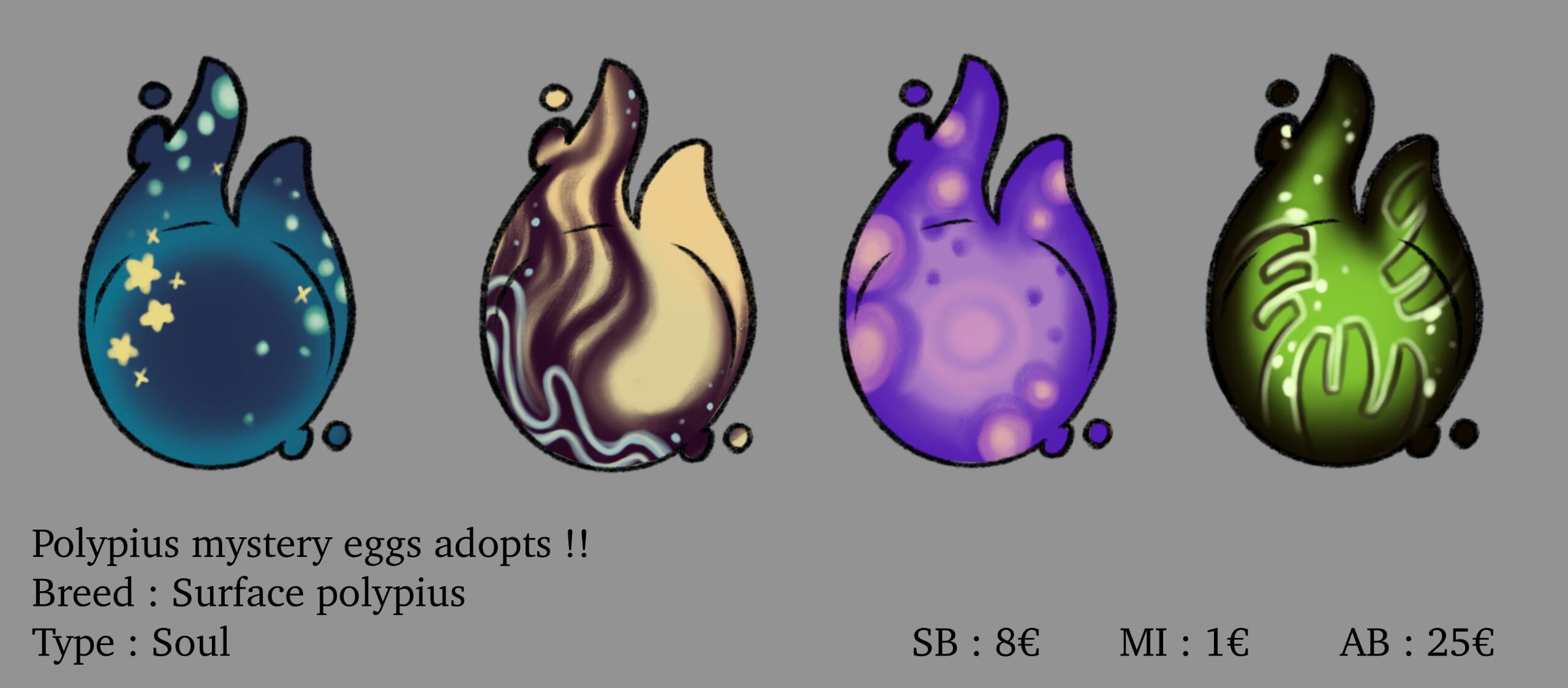 BY ADOPTING ONE :- Polypius are available has mystery eggs or simple adopts...They are often made by Nahldriin. There will maybe have some events with other artistes one day, but not for now !- A bid systeme is mainly used to sell them !- To catch your Polypius, check Nahldriin's socials to check each batch drop ! For now, Polypius are sold on Instagram (@nahldriin) and on the Nahldriin's worlds Discord server ( You can find the link on the home page) !- Here are some exemples of what adopts can look like :